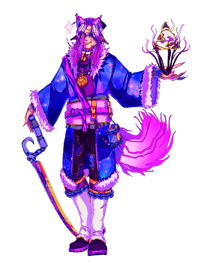 His cat form superficially resembles a white Siberian forest cat, with a big fluffy tail. The cat form itself has two appearances over the course of the story; a giant single cyclops-like eye taking up the entire front of the head pre-Eighth, and a more normal cat head but with one eye and half the muzzle gouged out and heavily scarred post-Eighth. In this form his ears, paws, and tail all have a violet gradient that helps camoflauge him amongst the snow and foliage of Feizhas.